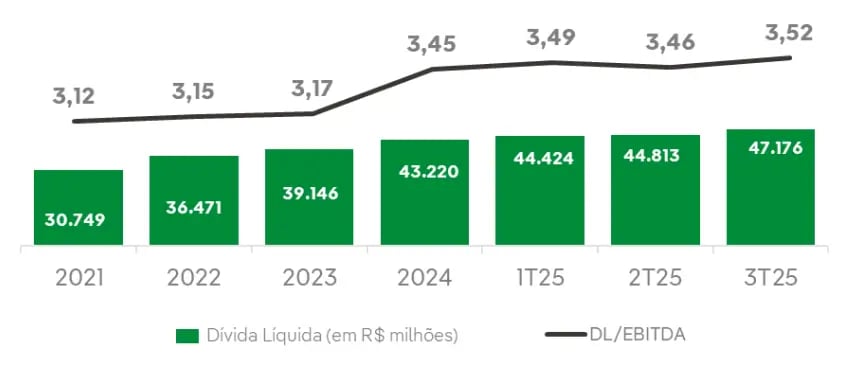 O Ebitda ajustado (caixa), que exclui VNR, efeitos de IFRS e operações corporativas, foi de R$ 2,8 bilhões, um crescimento de +13% em relação ao ano anterior. A margem Ebitda, considerando a receita líquida consolidada, teve leve aumento: 21,6% no 3T25 ante 21,0% no 3T24.
