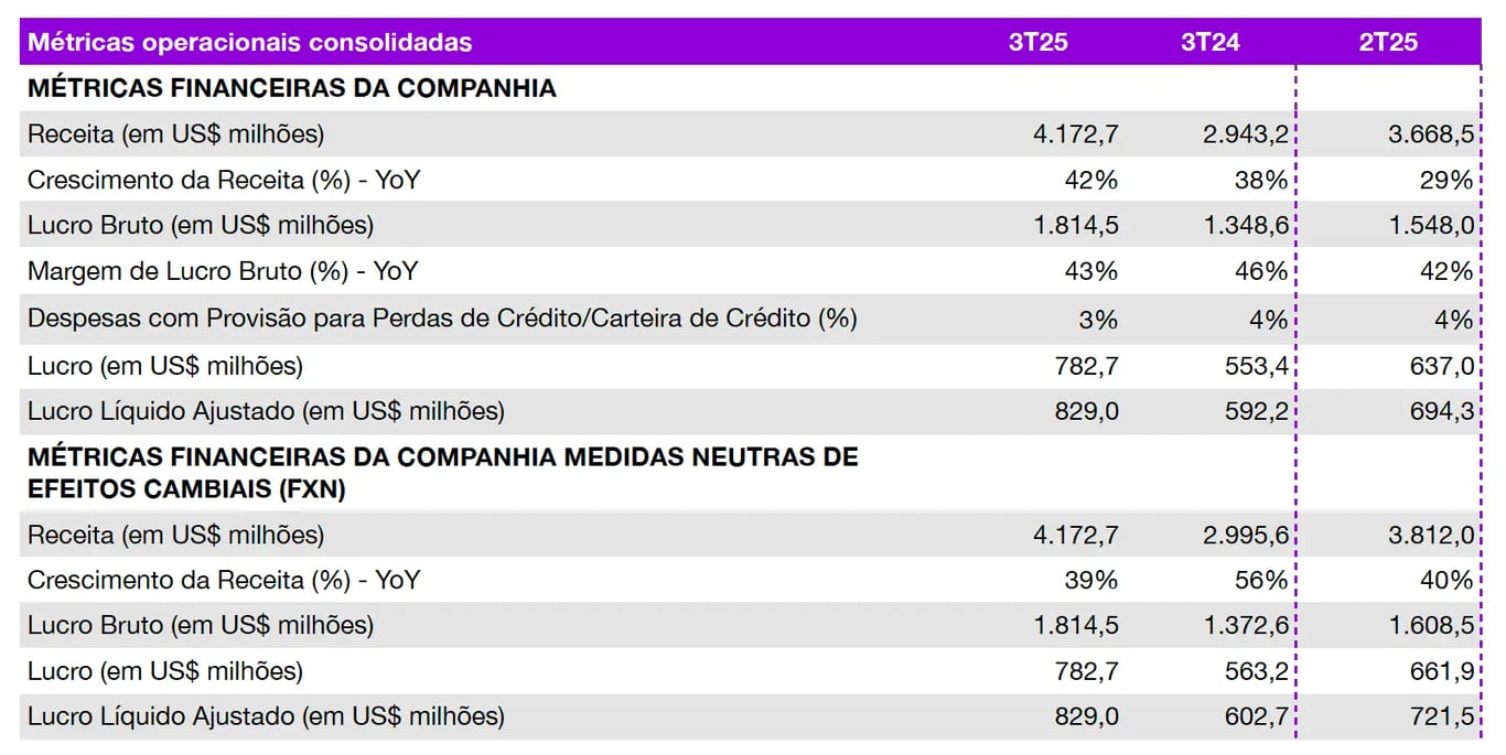 ROXO34 tem receitas recorde de US$ 4,2 bi e lucro de US$ 783 mi no 3T25 (+39%). Veja os destaques do balanço e perspectivas para 2025