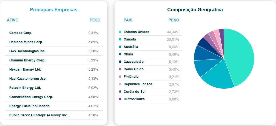 A carteira conta com 28 ações, com as principais alocações em Cameco (9,31%), Denison Mines (5,89%) e BWX Technologies (5,58%).