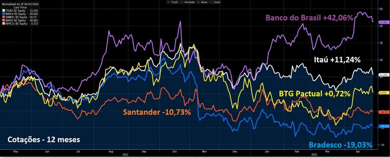 Entre os grandes bancos, as ações BBAS3 acumulam a maior alta, com ganhos de 42,06% nos últimos 12 meses.