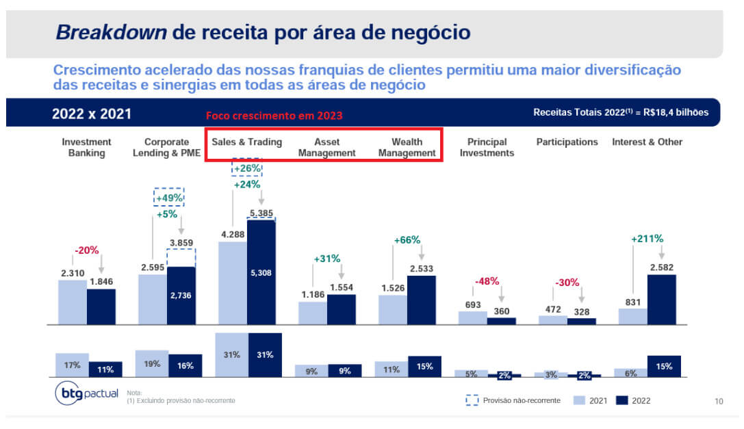Vale mencionar que a dinâmica do BTG Pactual em comparação com os demais bancos é bastante distinta. A companhia possui resultados no banco de varejo (Consumer Banking), mas seus negócios são bem pulverizados entre mesa de operações, gestão de fundos e fortunas e portfólio de crédito.