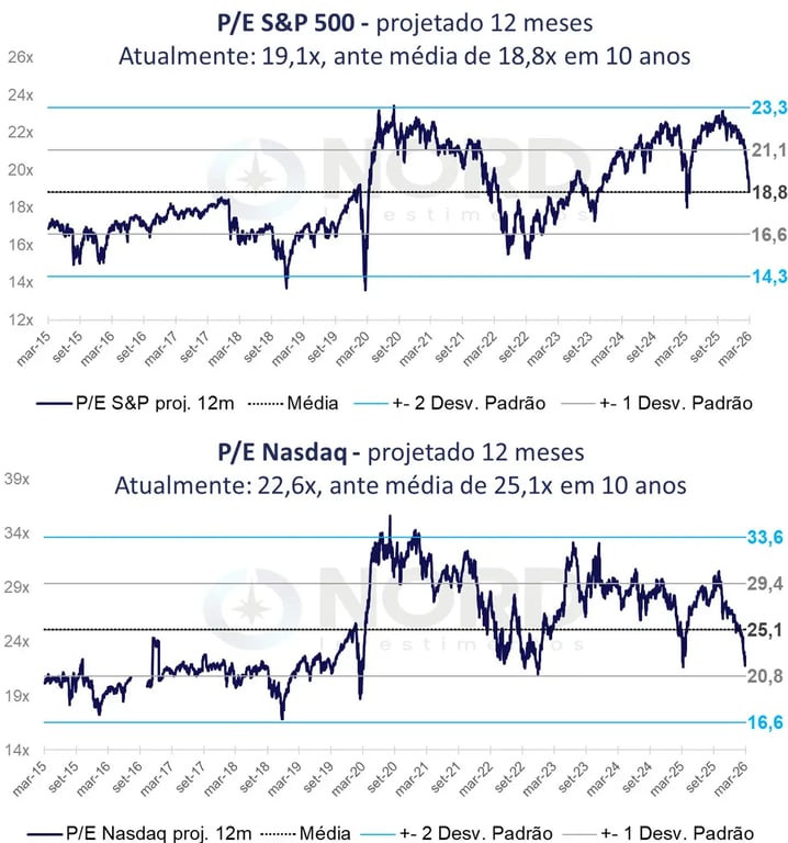 No fundo, essa é a ironia do mercado. Muita gente queria comprar Bolsa americana quando o S&P 500 negociava a 23x lucro e a Nasdaq a 30x. Agora que os preços ficaram mais convidativos, a vontade costuma diminuir porque o desconforto aumentou.