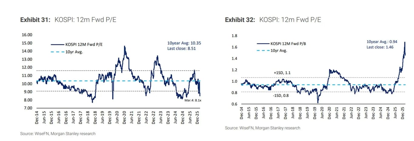 Aqui, há mais dúvidas do que convicções. O mercado continua otimista com os resultados esperados para Samsung e SK Hynix nos próximos 12 meses, o que ajuda a explicar por que a Bolsa negocia a 8,5x lucro, abaixo da média de 10,3x.
