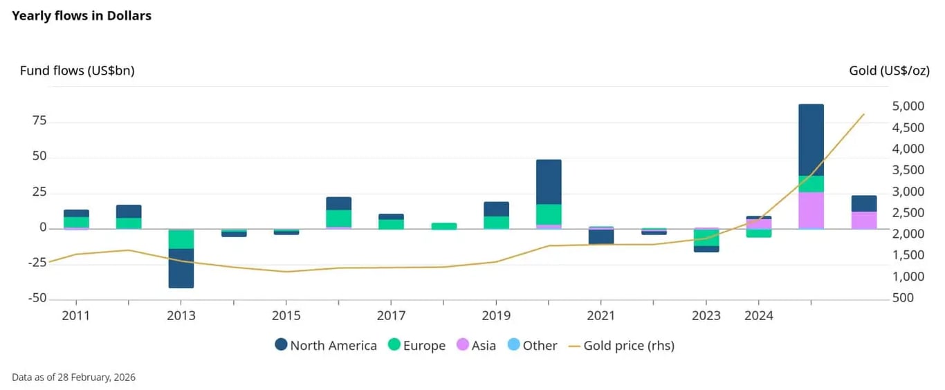 A resposta passa pelo que o metal se tornou ao longo da alta. Em 2025, a demanda por ETFs de ouro cresceu de forma muito forte, com entrada de US$ 89 bilhões, bem acima dos US$ 4 bilhões de 2024 e até do recorde de US$ 49,5 bilhões em 2020.