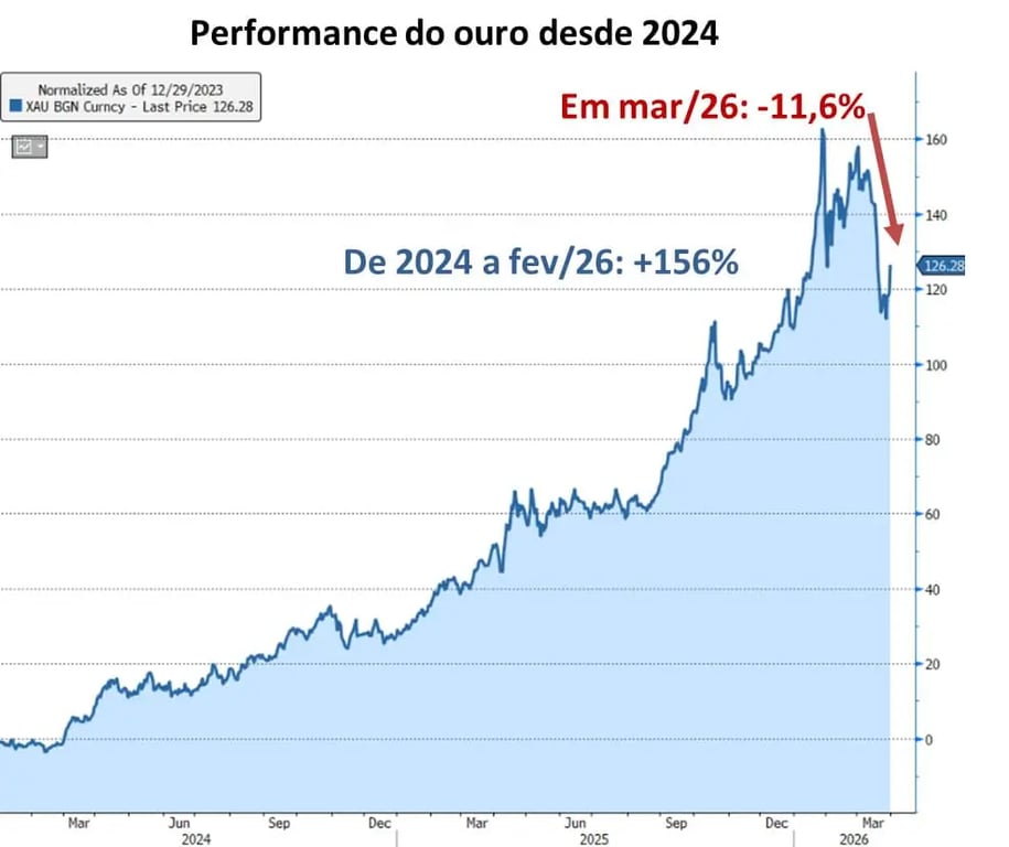 Em março, porém, o roteiro mudou. Mesmo com a escalada dos conflitos no Oriente Médio, o ouro caiu -11,6%.