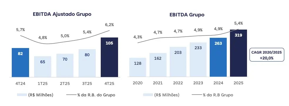 Inclusive, analisando o desempenho do varejo (hoje, praticamente 100% da receita da companhia), a receita que, até 2020, crescia cerca de +12% a.a. em média, passou a crescer +17% a.a. entre 2020 e 2025. Vale destacar também que, além do crescimento de top line, a companhia também registrou melhora de suas margens, com seu Ebitda crescendo ainda mais na média (+20% a.a.) e atingindo uma margem de 5,4% (+1,1 p.p. vs. 2024).