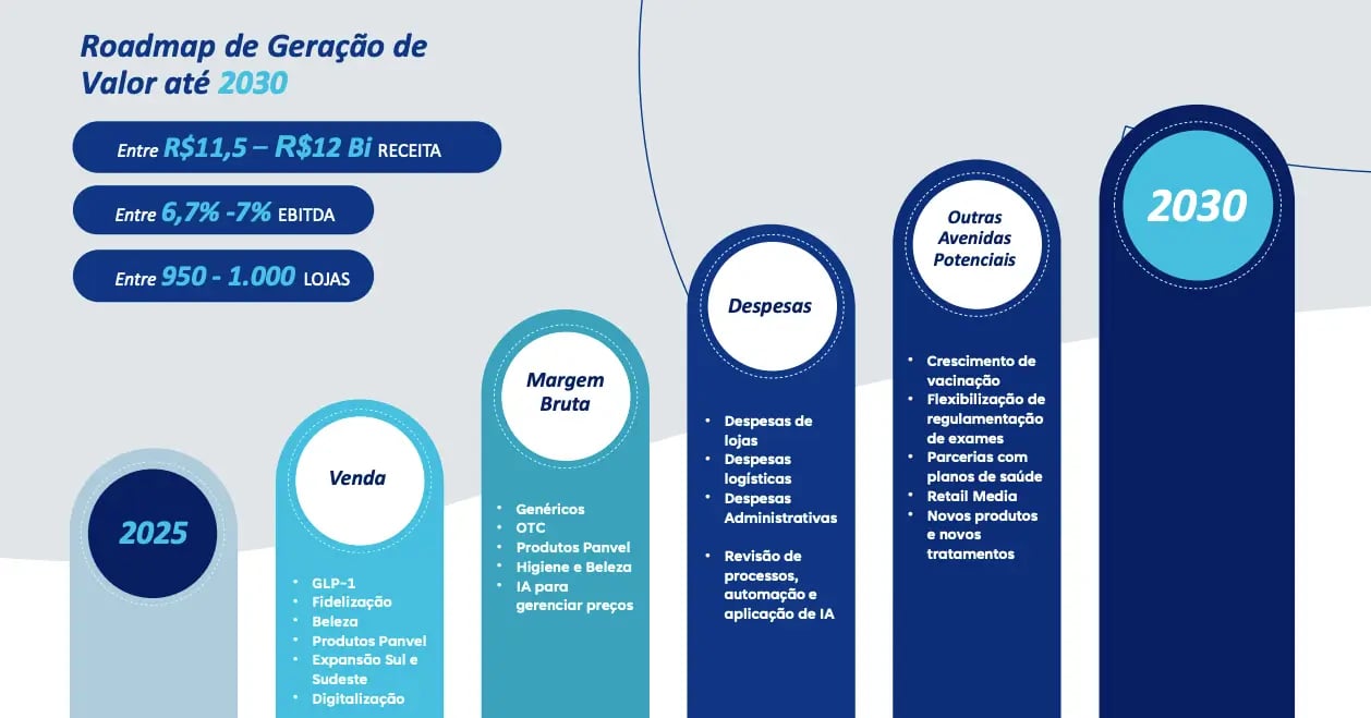 Além de uma nova expansão de suas unidades (+44% a +52%), a companhia enxerga outras avenidas de crescimento, como o aumento das vendas de GLP-1, a expansão da marca Panvel, uma maior penetração digital, a fidelização de seus clientes, entre outras. A Panvel ainda buscará melhorar suas margens com iniciativas voltadas à inteligência artificial (precificação, revisão de processos etc.) e reduções de despesas operacionais.