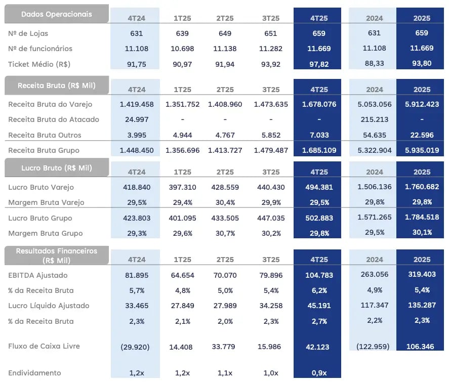 A Panvel (PNVL3) registrou uma receita bruta de R$ 1,69 bilhão no 4T25, alta de +16% na comparação anual. Já o Ebitda foi de R$ 105 milhões (+28%), enquanto o lucro líquido totalizou R$ 45 milhões, +35% de crescimento em relação ao 4T24.