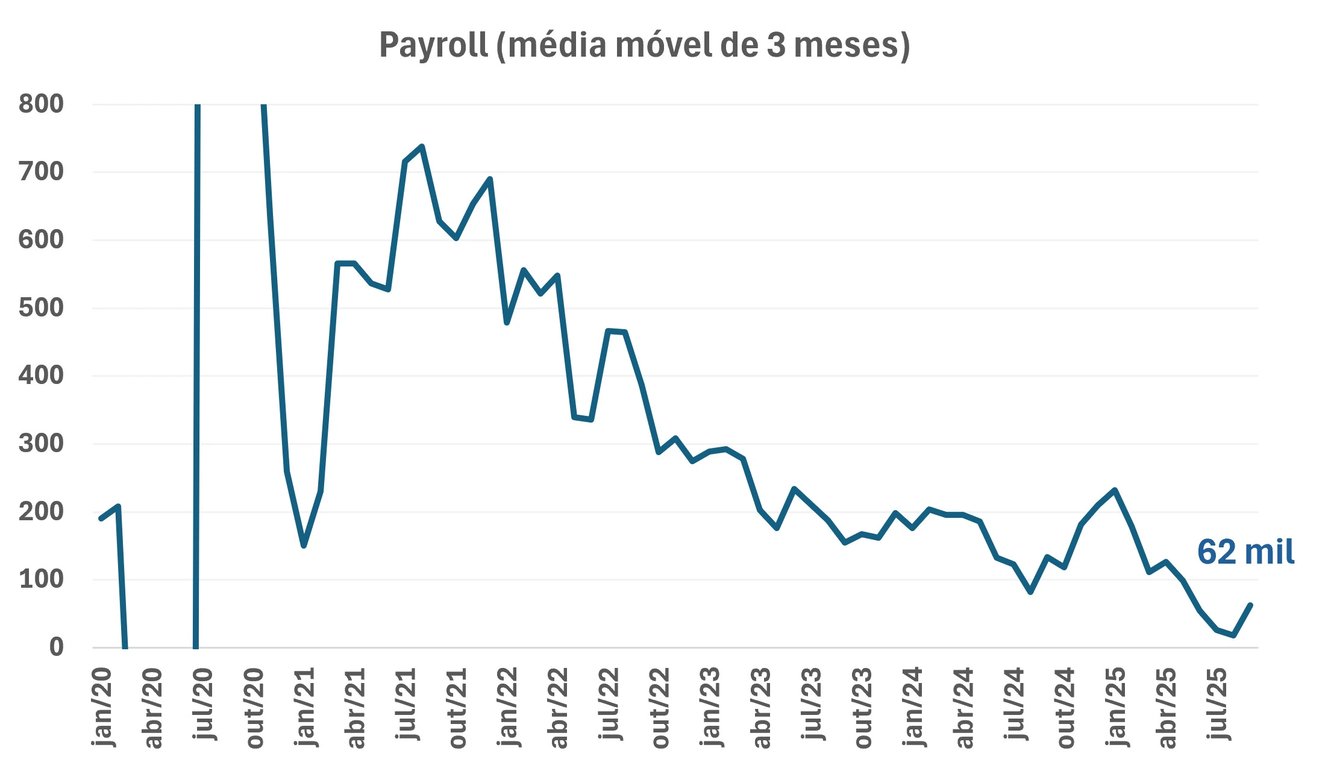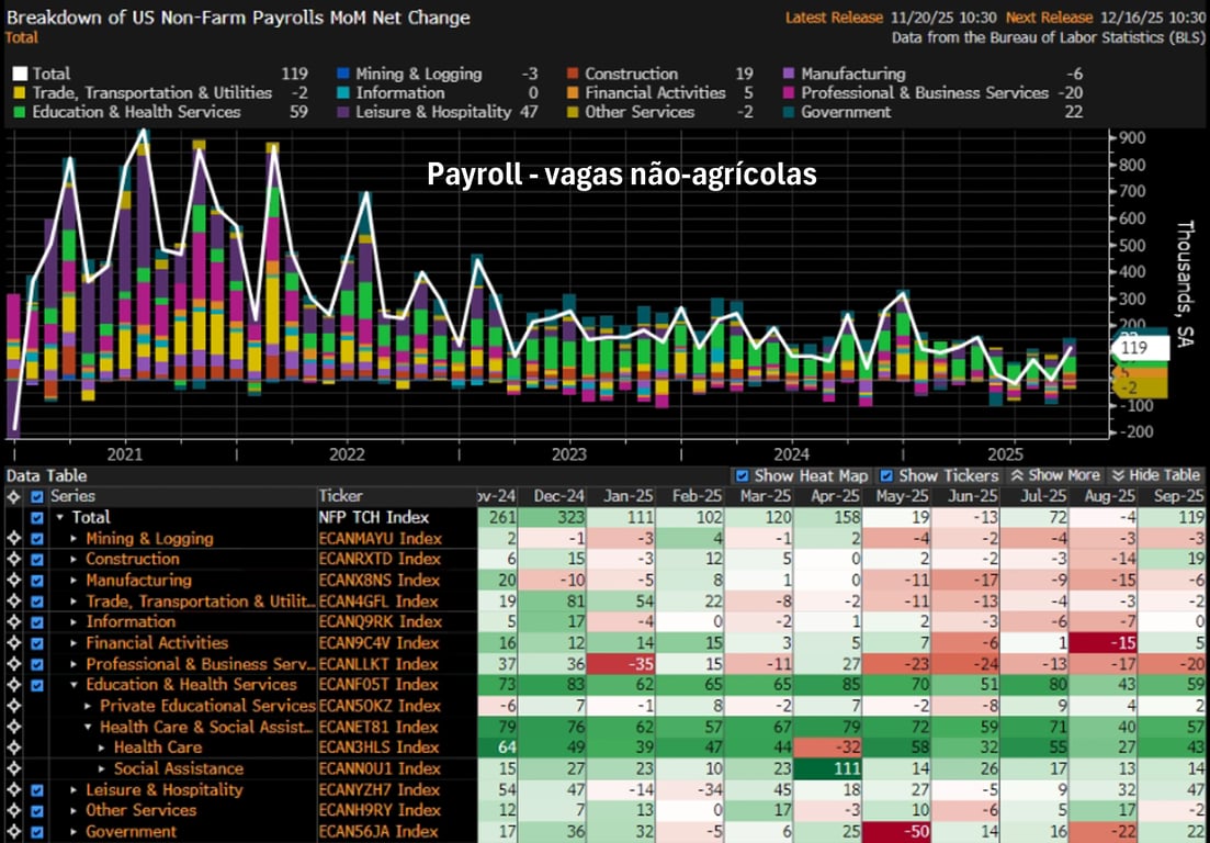 Após atraso na divulgação devido à paralisação do governo americano, o Payroll de setembro mostrou uma dinâmica que já estávamos observando: o mercado de trabalho está desacelerando gradualmente, mas não compactua com um cenário de recessão.