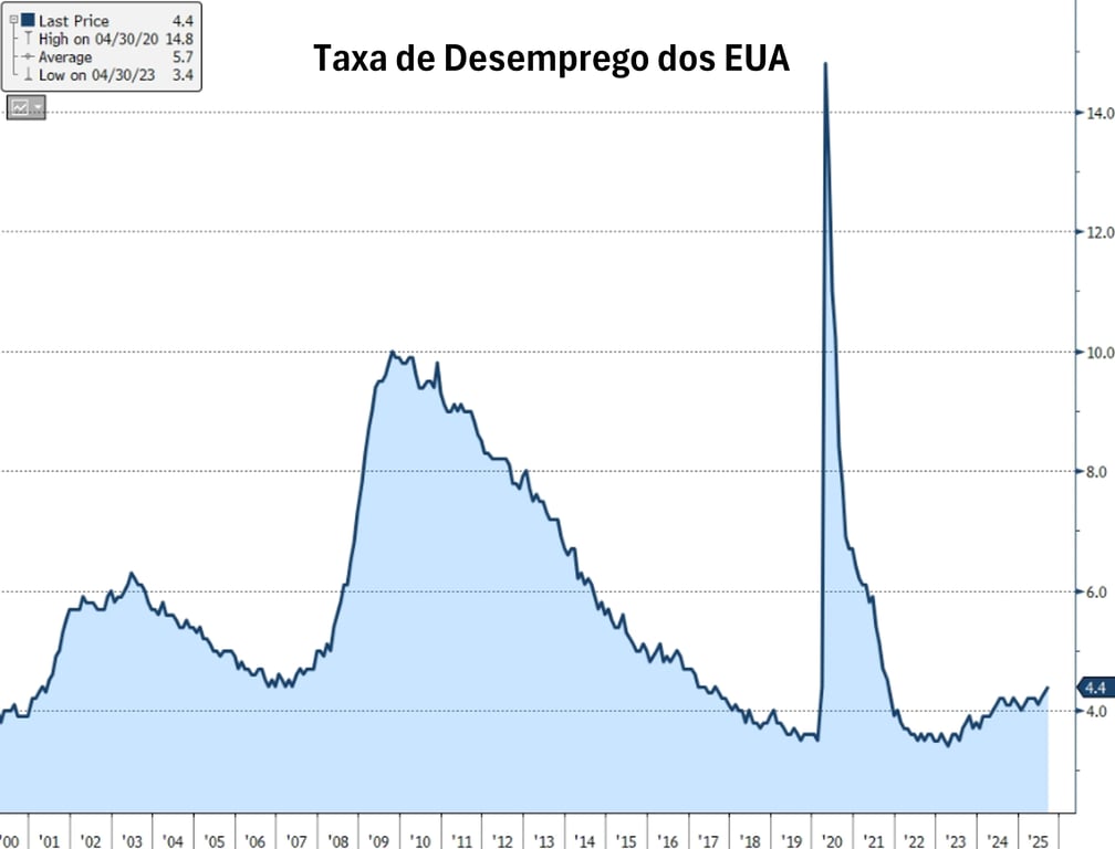 A taxa de desemprego subiu de 4,3% para 4,4%. Apesar de o desemprego ainda ser baixo, esse patamar de 4,4% é o maior desde outubro de 2021 (4,5%).
