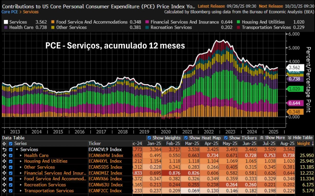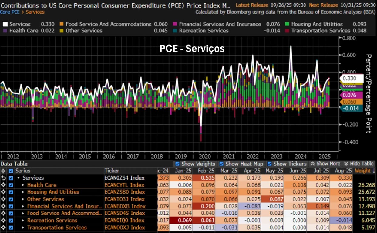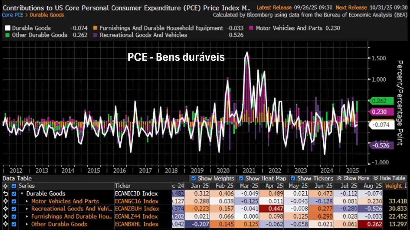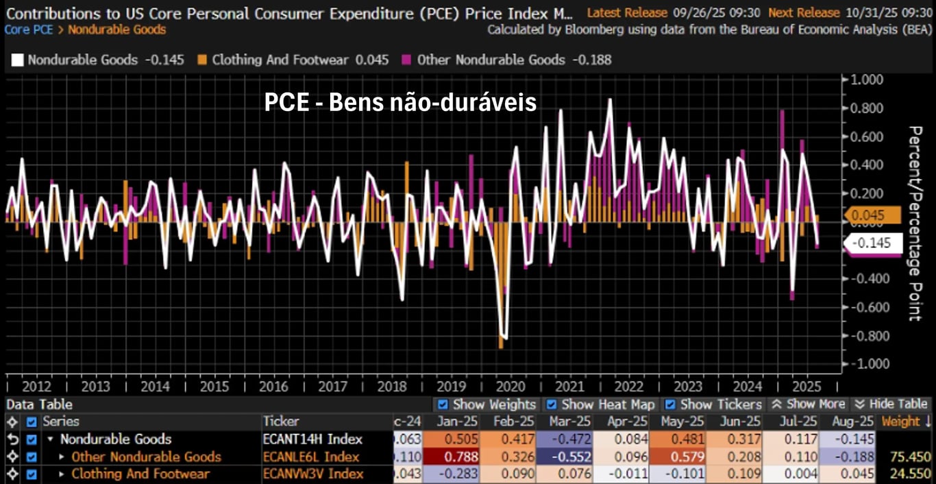 A boa notícia do PCE veio da inflação de bens. Mesmo em meio aos temores com os impactos das tarifas de importação, bens duráveis e não duráveis apresentaram deflações de -0,07% e -0,15%, respectivamente.