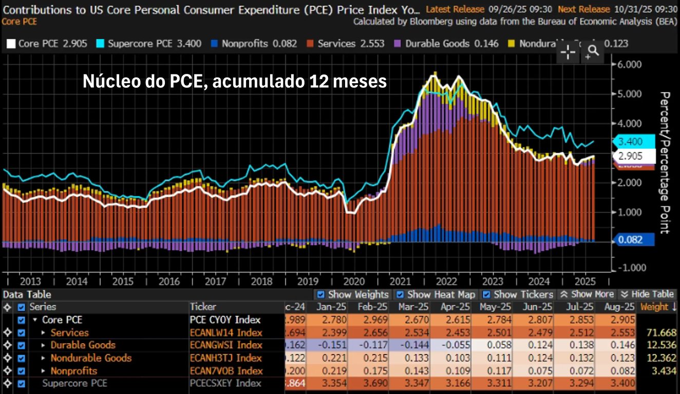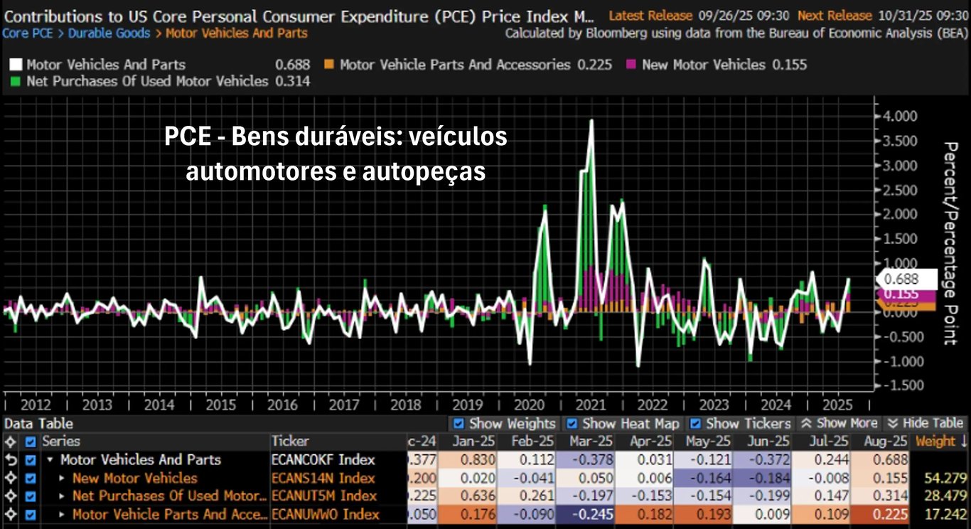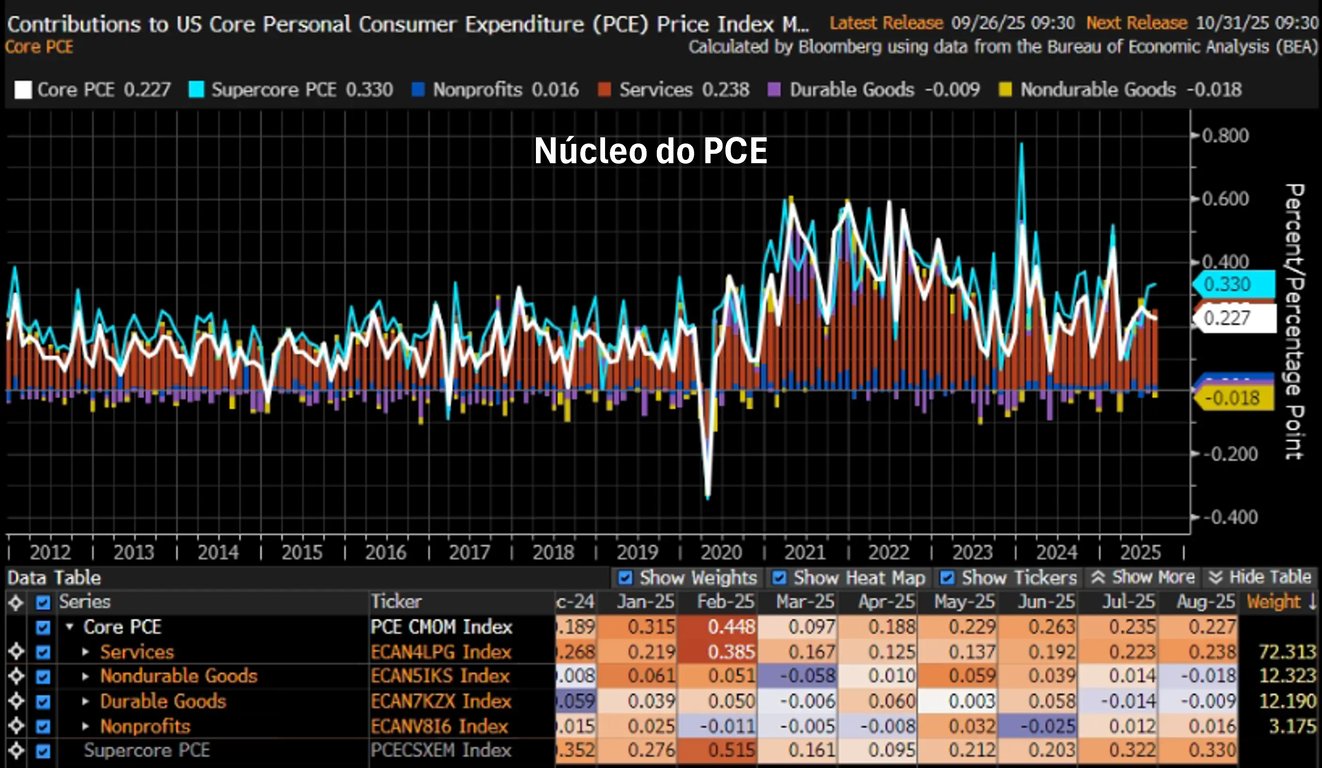A boa notícia do PCE veio da inflação de bens. Mesmo em meio aos temores com os impactos das tarifas de importação, bens duráveis e não duráveis apresentaram deflações de -0,07% e -0,15%, respectivamente.