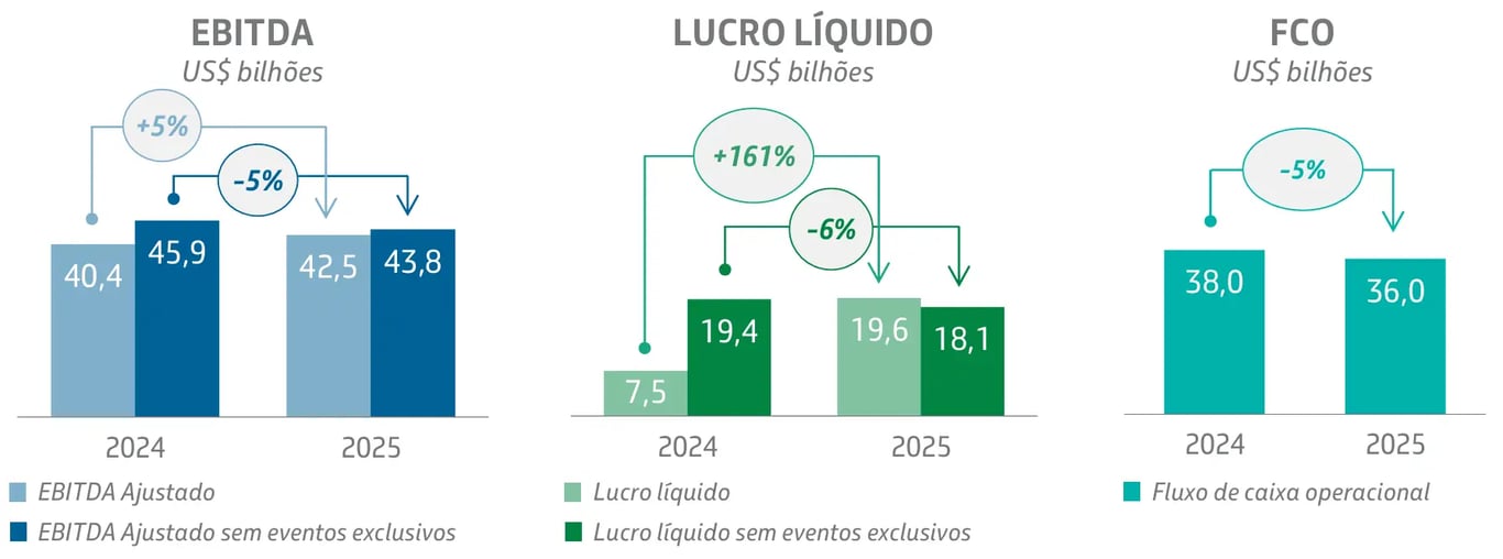 O lucro líquido, por sua vez, ficou em US$ 2,9 bilhões, revertendo o prejuízo de US$ 2,8 bilhões registrado no 4T24.