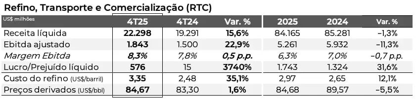 No segmento de Refino, Transporte e Comercialização (RTC), o volume total de vendas atingiu 1,8 milhão de barris por dia no 4T25, permanecendo praticamente estável na comparação anual (+0,7%).