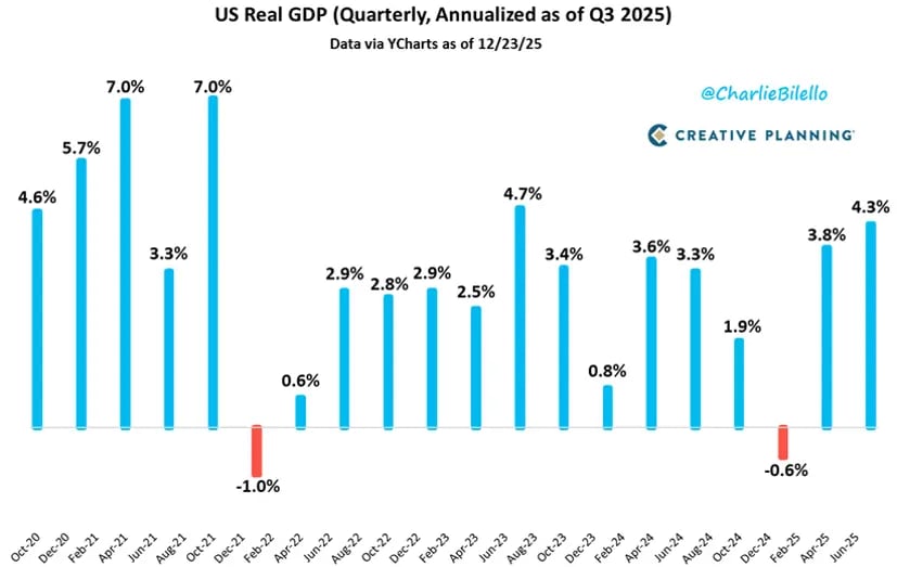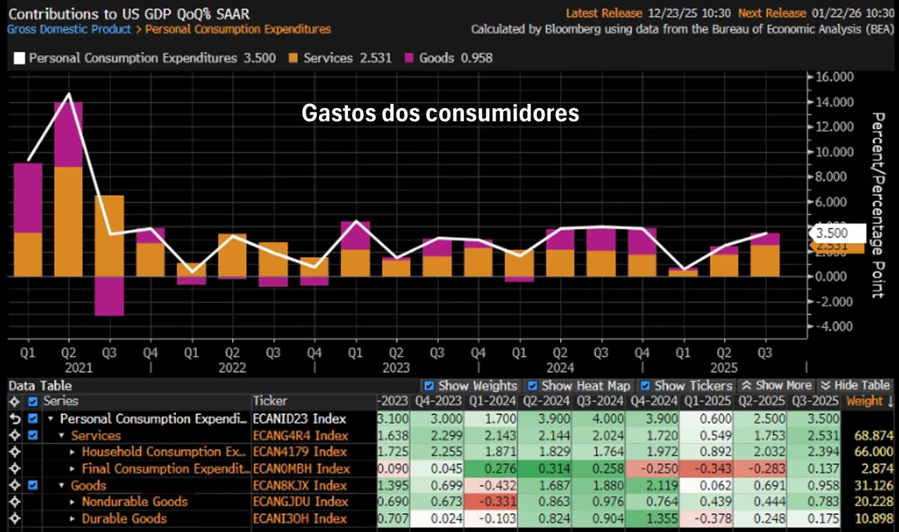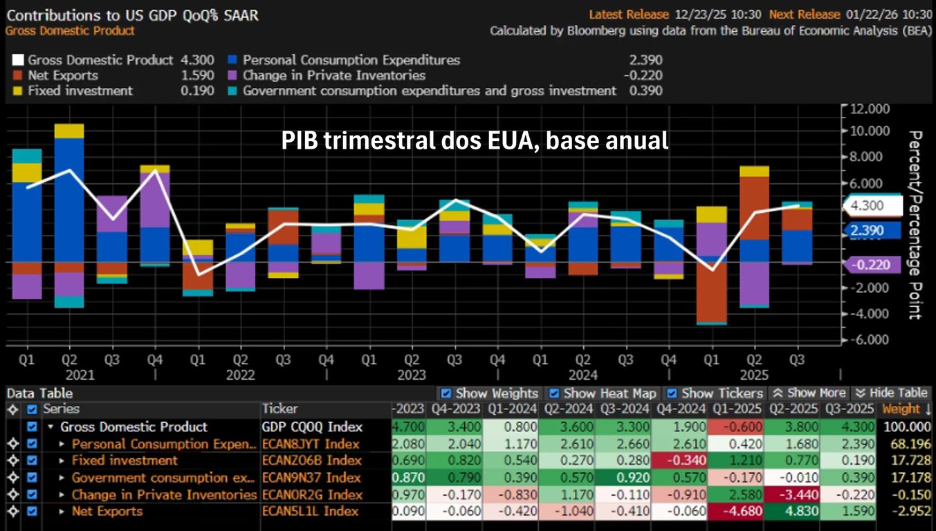 O PIB dos EUA subiu +4,3% no terceiro trimestre (em base anualizada), bem acima das expectativas do mercado, de +3,3%. Esse forte resultado vem após alta de +3,8% no segundo trimestre e de +3,3% no terceiro trimestre de 2024.