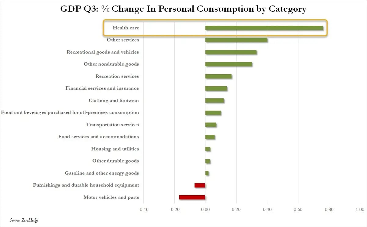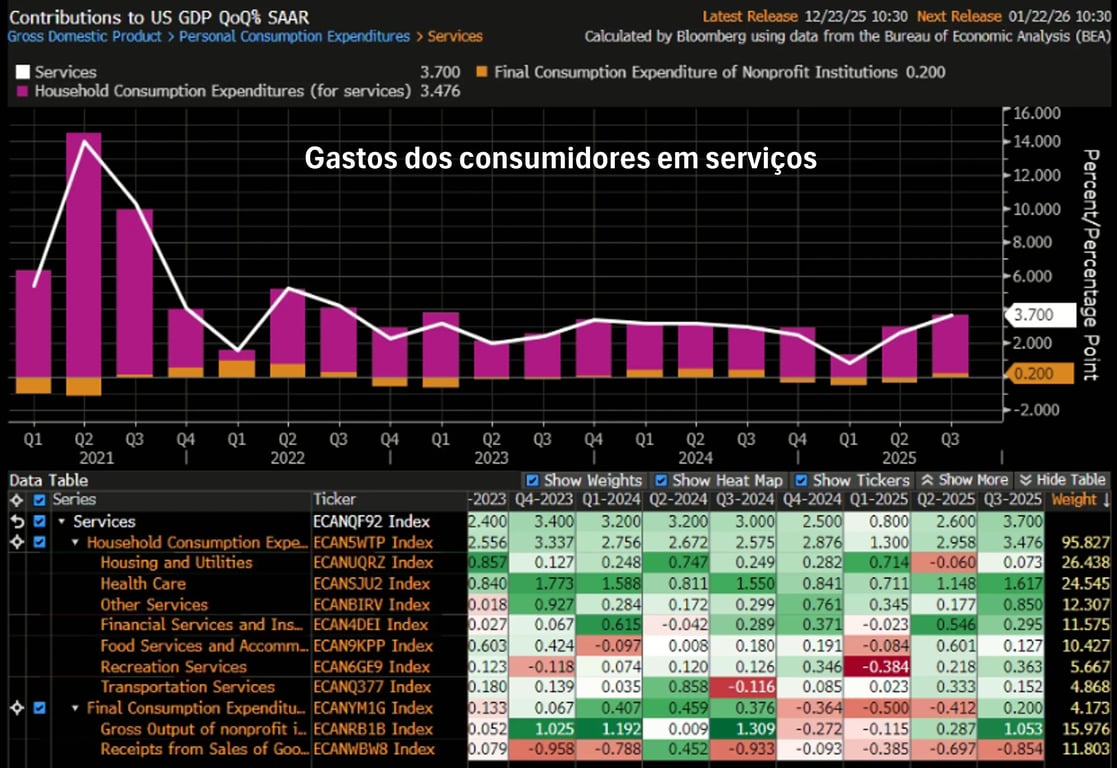 Apesar do bom número dos gastos dos consumidores em serviços indicar uma economia resiliente, vale ressaltar que uma parcela importante desse resultado veio dos gastos com saúde (health care), cuja contribuição para o PIB acelerou de +0,54 p.p. para +0,76 p.p.