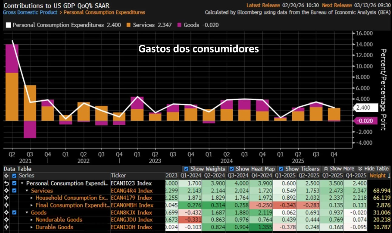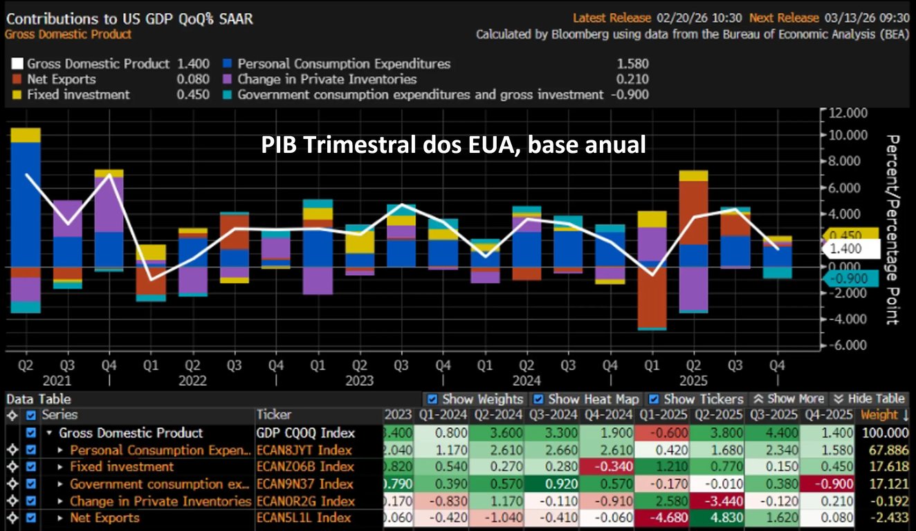 No quarto trimestre, o PIB dos EUA apresentou um crescimento de +1,4% (em base anualizada), abaixo das expectativas de +2,8%. Esse resultado vem após alta de +4,4% no trimestre anterior e de +1,9% no quarto trimestre de 2024.