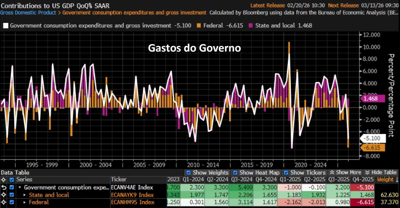 A desaceleração do crescimento econômico dos EUA foi motivada pela forte queda nos gastos do governo, de -5,1%, o pior resultado desde o terceiro trimestre de 2020 (-6,6%) e um dos menores da história, motivado pelo período de paralisação do governo (shutdown) no período.