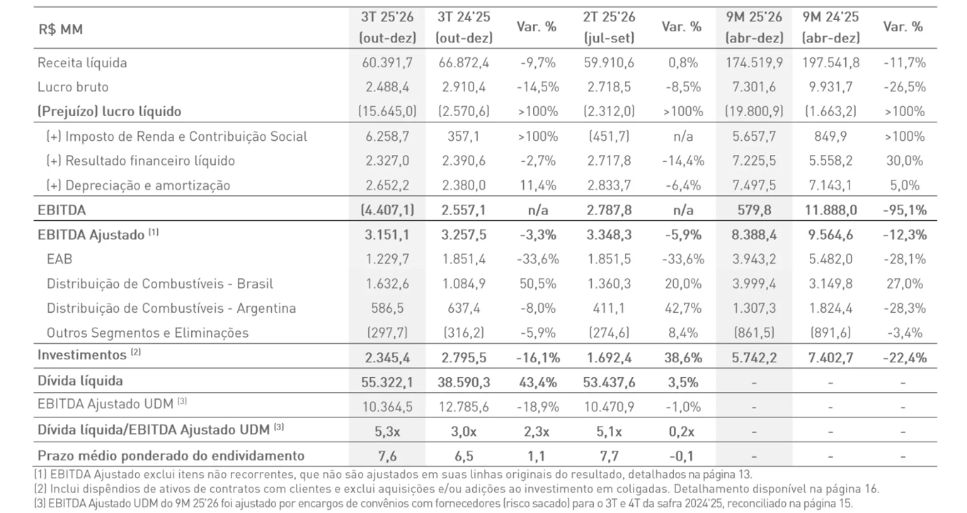 No trimestre, a Raízen reportou uma receita líquida de R$ 60,4 bilhões no 3T 25/26, recuo de -9,7% na comparação anual. O Ebitda ajustado foi de R$ 3,1 bilhões, -3,3% menor quando comparado ao mesmo período da safra anterior (2024/25). E o destaque do balanço ficou para o prejuízo líquido de R$ 15,6 bilhões, contra um prejuízo de R$ 2,6 bilhões no 3T 24/25.