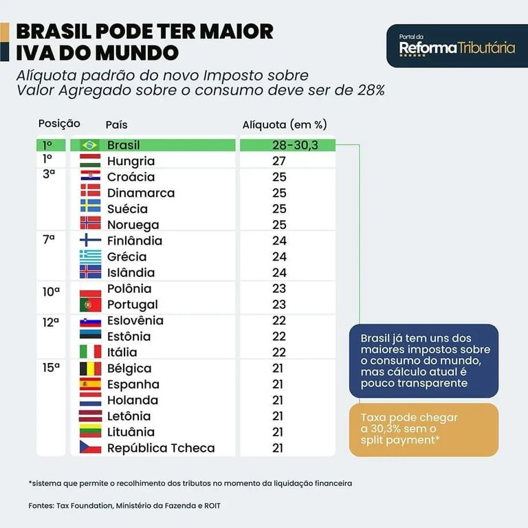 O dado que mais chama atenção é claro: o Brasil caminha para ter o maior IVA do mundo, algo em torno de 28%, nível semelhante ou superior ao de países desenvolvidos da Europa.