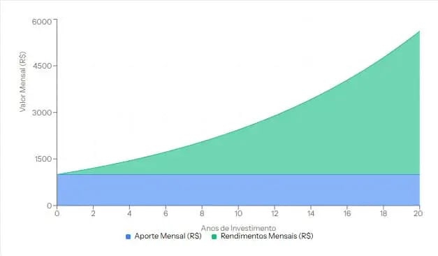 No início, os rendimentos parecem pequenos. Mas com o tempo, somados aos aportes, o crescimento se acelera.