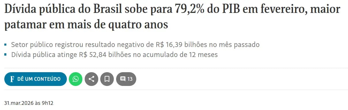 A dívida pública do Brasil atingiu 79,2% do PIB. Entenda o risco fiscal e como ele impacta seus investimentos e decisões financeiras
