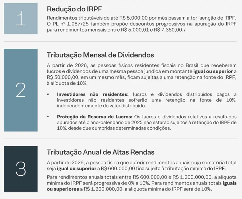 A proposta já aprovada na Câmara cria isenção de IR para quem recebe até R$ 5.000 por mês, compensada pela cobrança de 10% sobre dividendos distribuídos acima de R$ 50 mil mensais, por sócio e por empresa.Na prática, a medida inaugura uma nova era na relação entre pessoas físicas e jurídicas, rompendo uma isenção que vigora desde 1995.