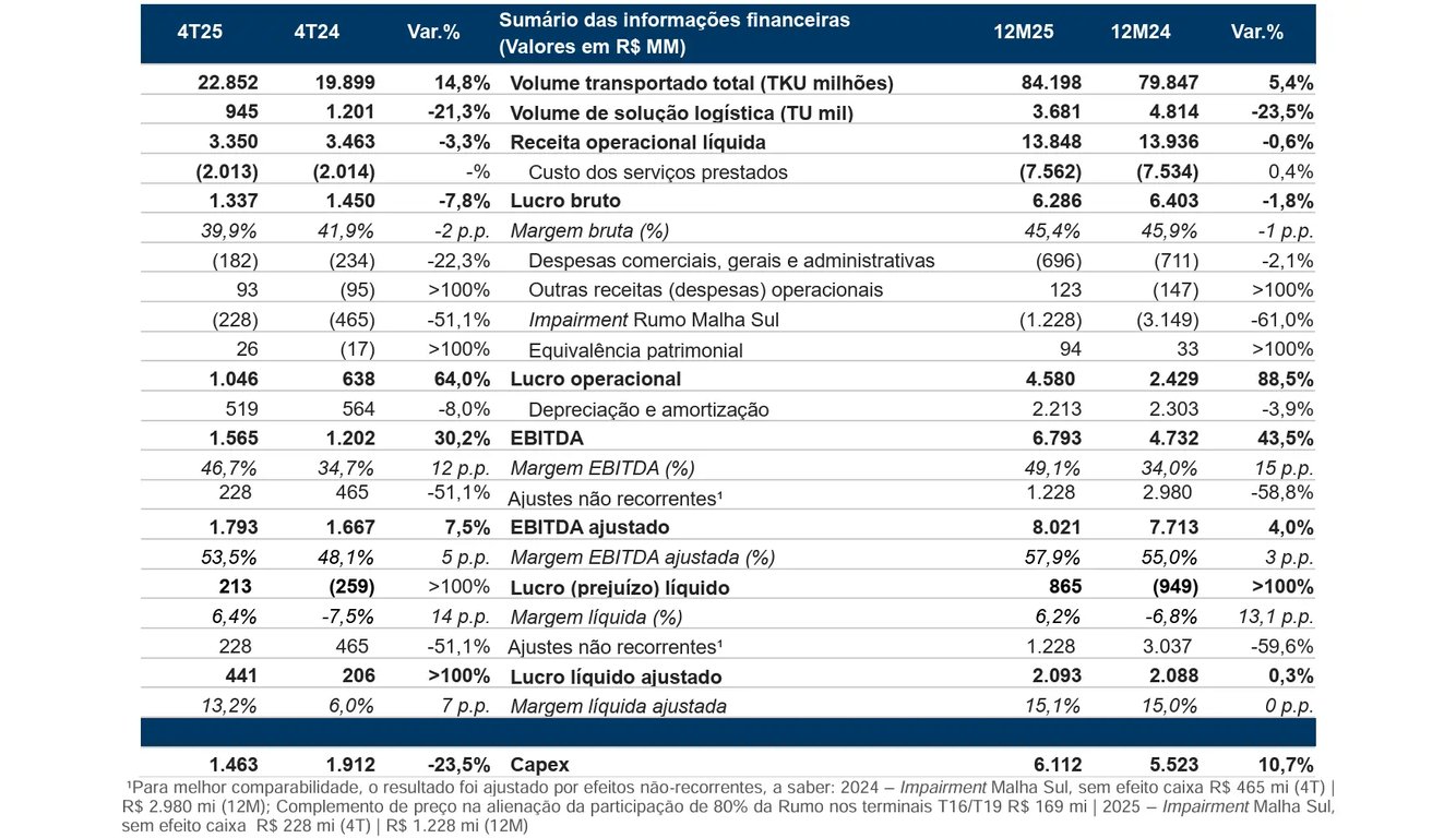 Fechando o ano de 2025, a Rumo entregou estabilidade na receita líquida (-0,6% a/a), crescimento de +4% do Ebitda e lucro líquido estável (+0,3% a/a).