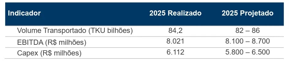 A companhia não divulgou guidance para 2026, contudo o consenso do mercado aponta para incremento de cerca de +8% no volume transportado neste ano. Com base nessa perspectiva, o consenso para 2026 é de crescimento de +4% da receita, +7% do Ebitda e +27% do lucro líquido.