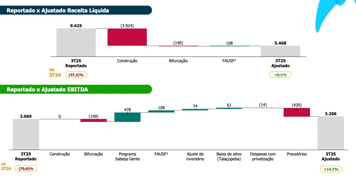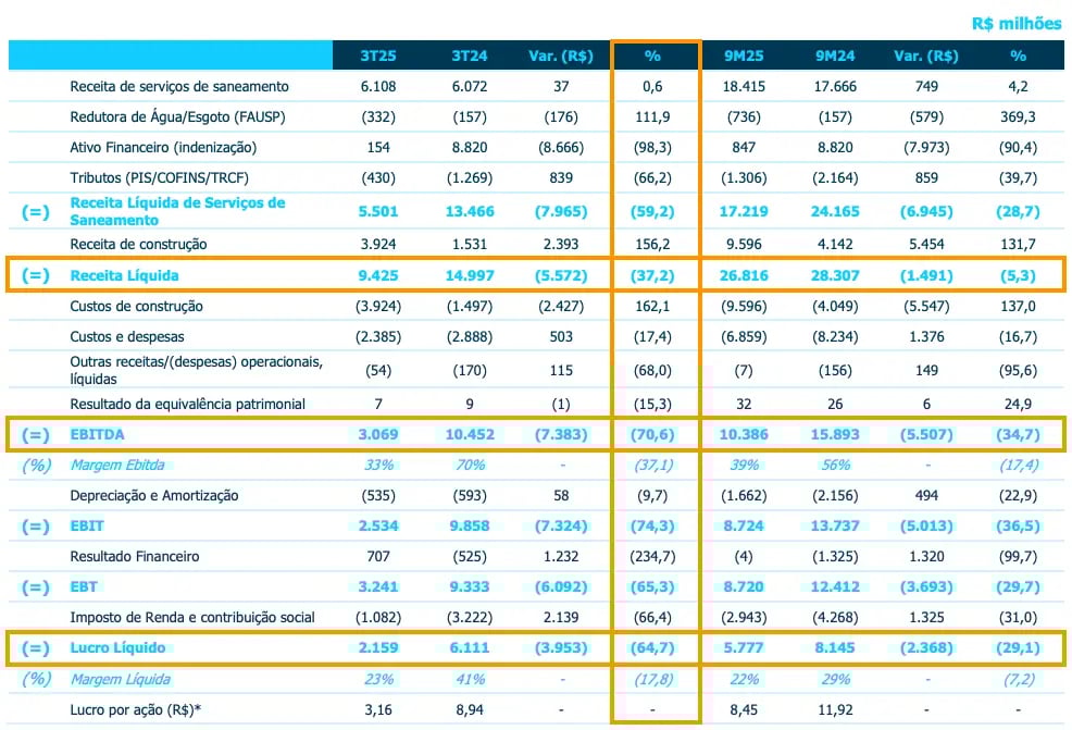 A Sabesp (SBSP3) reportou uma receita líquida de R$ 9,4 bilhões no 3T25, uma baixa de -37%, um Ebitda de R$ 3,1 bilhões (-31%) e um lucro líquido de R$ 2,2 bilhões (-65%). Todos os resultados foram comparados com o mesmo período em relação ao ano anterior.