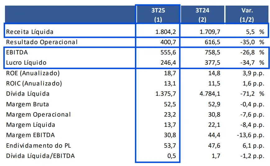 Mesmo com um resultado financeiro positivo em R$ 49 milhões (vs. um negativo em R$ -49 milhões no 3T24), as maiores despesas com depreciação e tributos impactaram o lucro líquido no período, que alcançou R$ 246 milhões, baixa de -34,7%.