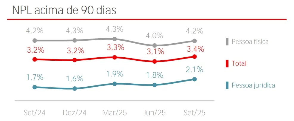 O índice de inadimplência acima de 90 dias ficou em 3,4%, ligeiramente acima dos 3,2% registrados no mesmo período do ano anterior. Já o índice de inadimplência entre 15 e 90 dias foi de 3,9% (+0,3 p.p.).