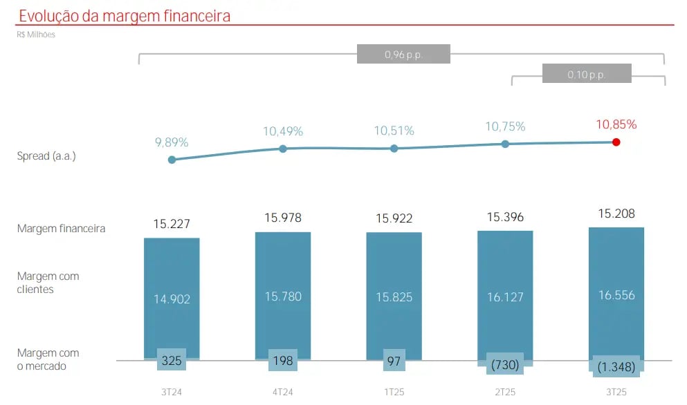 A carteira de crédito ampliada do Santander atingiu R$ 688,8 bilhões, registrando um crescimento de +3,8%. O spread — diferença entre a taxa de juros cobrada em empréstimos e a taxa paga para captação de recursos — foi de 10,9%, com alta de +1 ponto percentual.