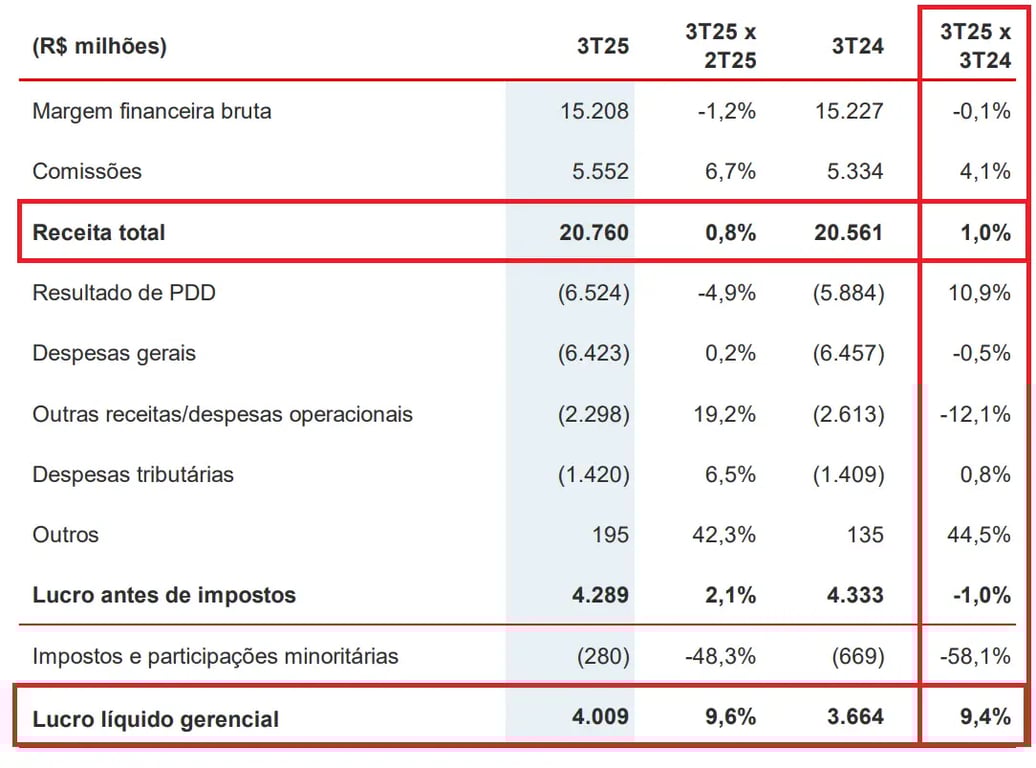 Com as comissões atingindo R$ 5,6 bilhões (+4%), a receita total (margem financeira bruta + comissões) chegou a R$ 20,8 bilhões, representando um crescimento de +1%.