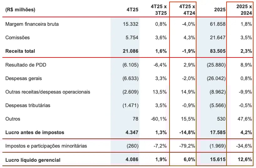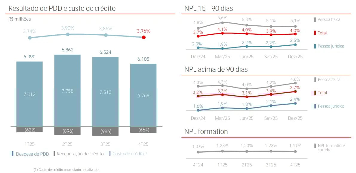 As provisões para devedores duvidosos (PDD) apresentaram um aumento de +3% no trimestre e de +9% no ano. Enquanto isso, as despesas gerais subiram +3% no 4T25 (com um índice de eficiência de 38,8%, +0,8 p.p.), mas caíram -2% em 2025.