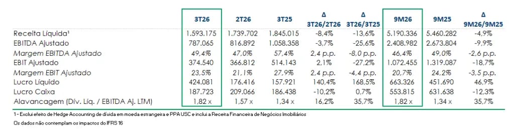 No 3T26, a receita líquida atingiu R$ 1,6 bilhão, representando queda de 13,6% em relação ao 3T25. Já o Ebitda ajustado somou R$ 787,1 milhões, recuo de 25,6% na comparação anual.