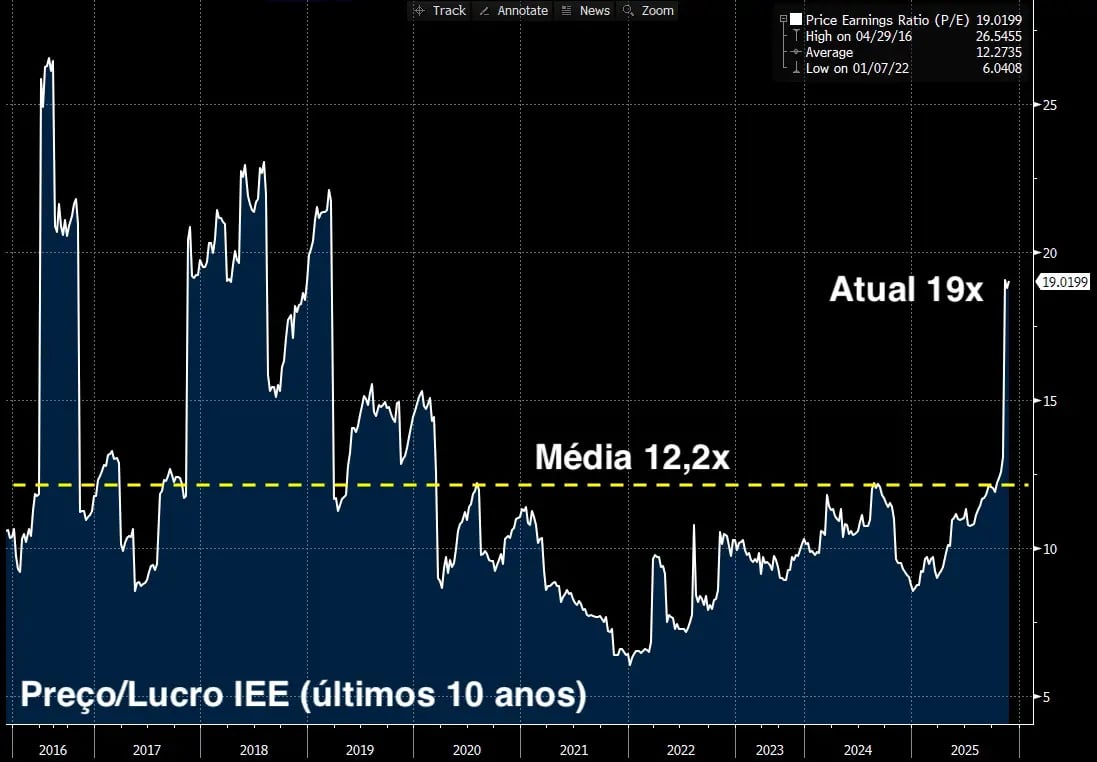 Hoje, o IEE negocia a um Preço/Lucro de 19x — acima da própria média dos últimos anos (12x) e também da média histórica da Bolsa brasileira (15x).