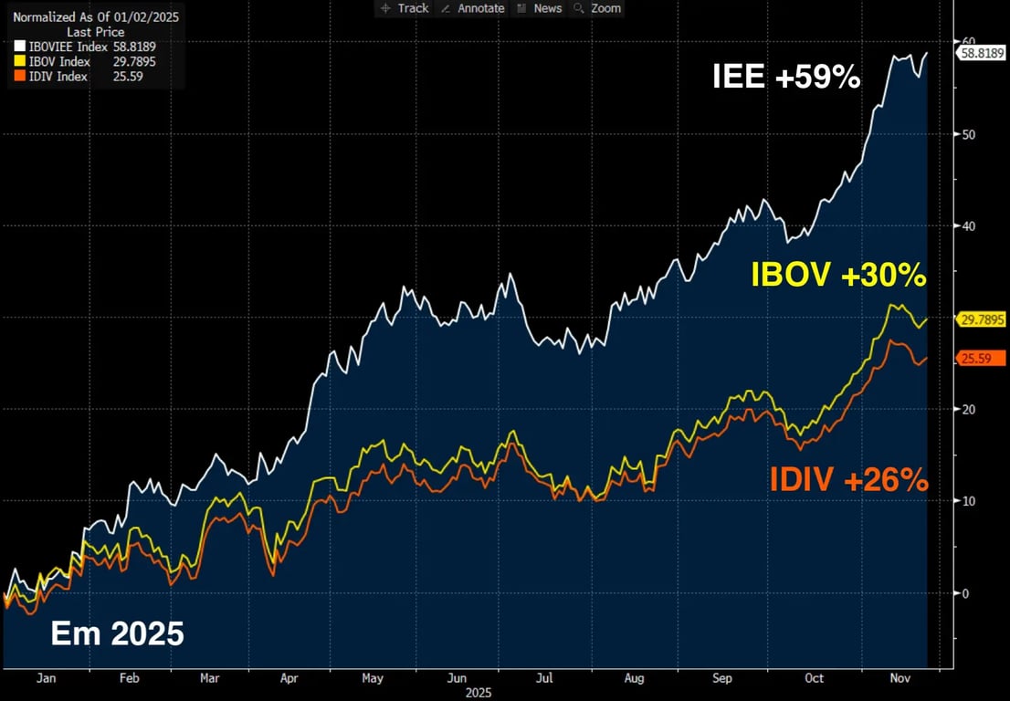 Em 2025, enquanto o IBOV e o IDIV acumulam altas respectivas de +30% e +26%, o IEE já sobe cerca de +59% — ou seja, quase o dobro do principal índice do país.