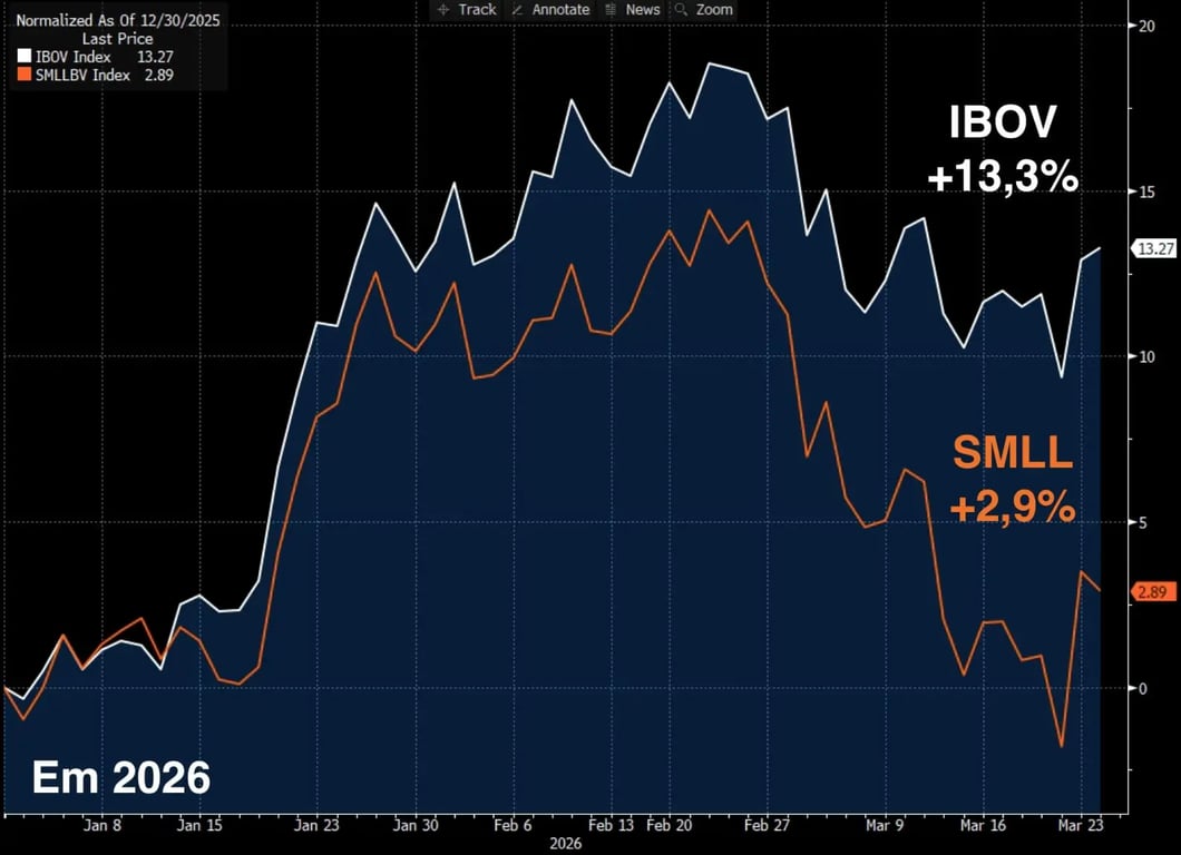 Apesar das correções recentes, as ações brasileiras seguem em alta em 2026. Enquanto o IBOV sobe +13,3% no acumulado do ano, o SMLL (índice de Small Caps) apresenta um movimento positivo mais tímido, de apenas +2,9%.