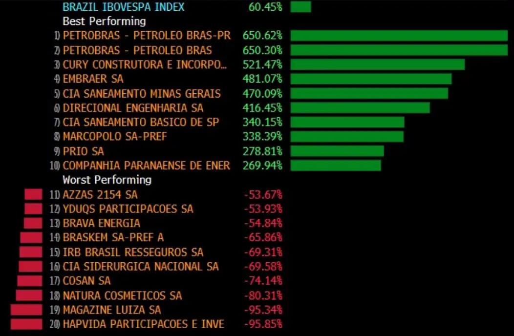 No período, 66 ações que passaram pelo IBOV tiveram movimento positivo, enquanto 57 caíram. Além das petroleiras mencionadas acima, o índice ainda foi impulsionado por nomes como Embraer (EMBJ3), Marcopolo (POMO4), entre outras posições com altas de três dígitos.