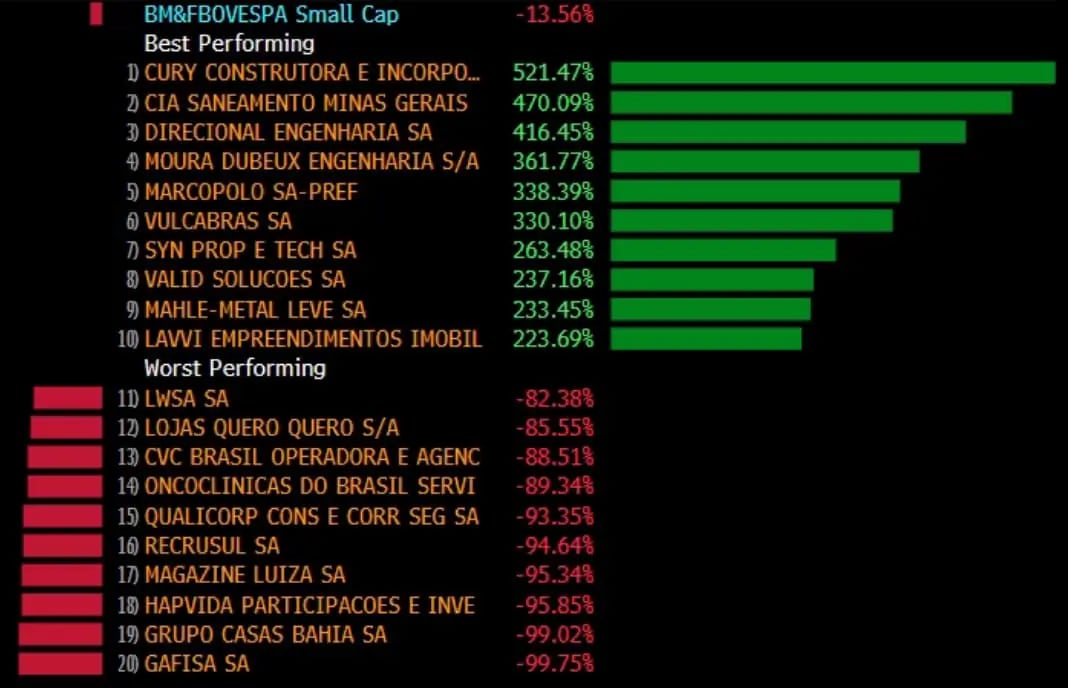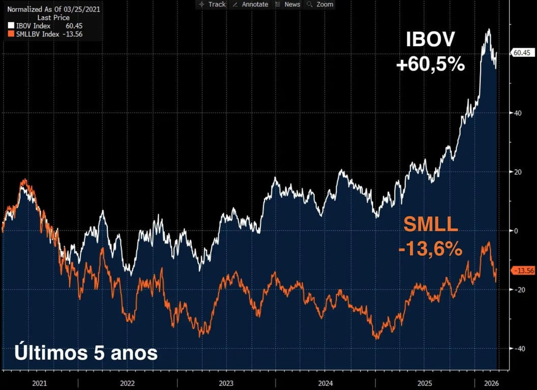 Entretanto, o movimento do IBOV x SMLL não é de hoje. Considerando a janela dos últimos cinco anos, o IBOV já acumula alta de mais de +60%, enquanto, do outro lado, o SMLL amarga uma baixa de quase -14%.