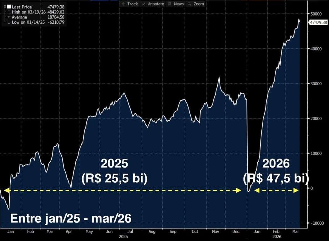 Inclusive, nos três primeiros meses de 2026, o fluxo acumulado de investimentos estrangeiros no mercado brasileiro já ultrapassou o acumulado do ano inteiro de 2025 e caminha para um valor quase duas vezes maior, de cerca de R$ 47,5 bilhões (vs. R$ 25,5 bi no último ano).