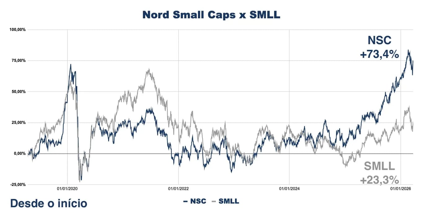 Em 2026, estamos subindo +7,6% (vs. +2,9% do SMLL). No ano passado, subimos +48% (vs. +30,7% do SMLL). Desde o início da série, acumulamos alta de +73,4% (vs. +23,3% do SMLL).