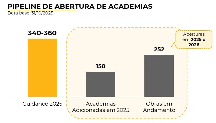 O guidance para abertura de academias em 2025 está entre 340-360 unidades. Até o 3T25, a empresa entregou 150 academias e possui um pipeline de 252 em obras.