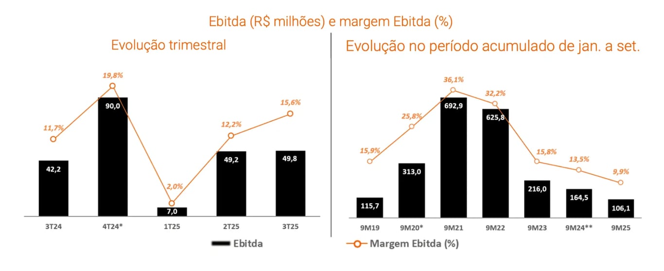 Entretanto, com os custos caindo menos (-33%) e as despesas operacionais subindo +19%, seu Ebitda (potencial de geração de caixa operacional) teve queda de -85%.