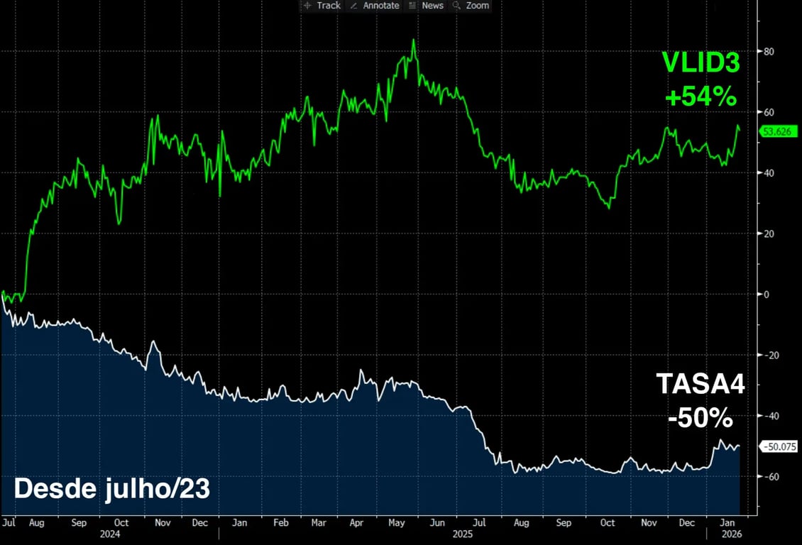 Desde a nossa recomendação, enquanto TASA4 caiu -50%, VLID3 subiu +54%.
