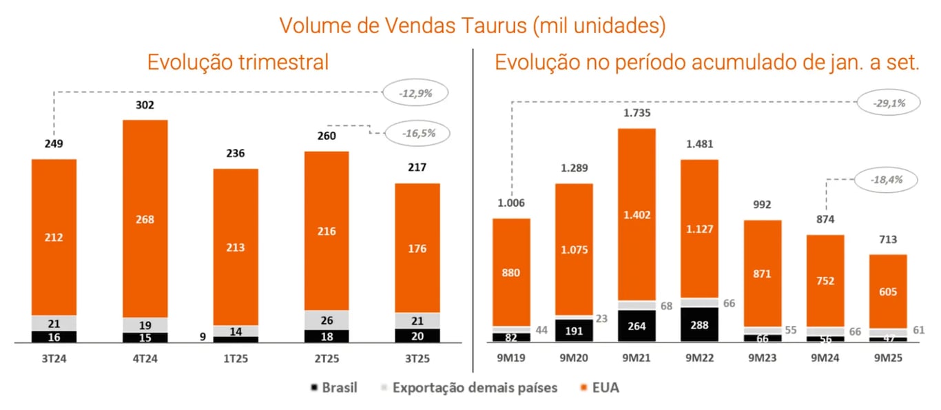 Dessa forma, o volume consolidado de vendas da Taurus caiu quase -60% desde 2021.