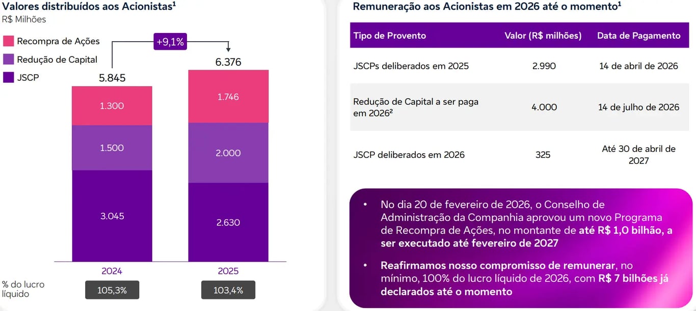 Cabe destacar que a companhia tem a intenção de distribuir um valor igual ou superior a 100% de seu lucro líquido (payout) em forma de proventos em 2026. No ano, os valores distribuídos já somam R$ 7 bilhões.