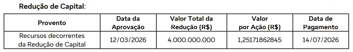 A companhia também anunciou a data de pagamento dos recursos decorrentes da redução de capital social a ser deliberada em Assembleia a ser realizada em 12 de março de 2026.