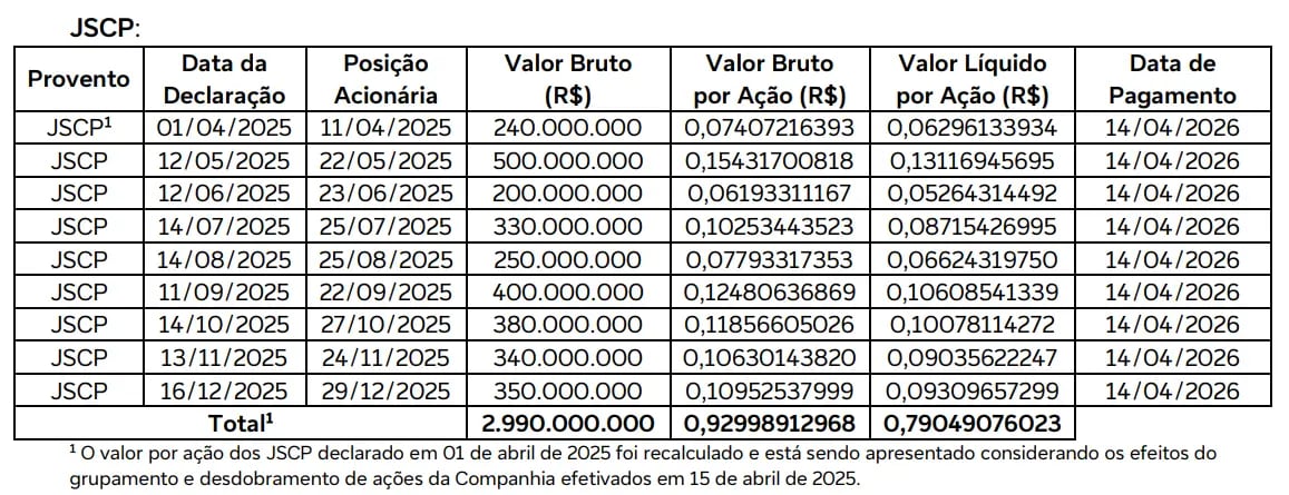 A Telefônica Brasil fixou a data de pagamento dos juros sobre capital próprio (JCP) que foram declarados no segundo, terceiro e quarto trimestres do exercício social de 2025, conforme tabela abaixo.